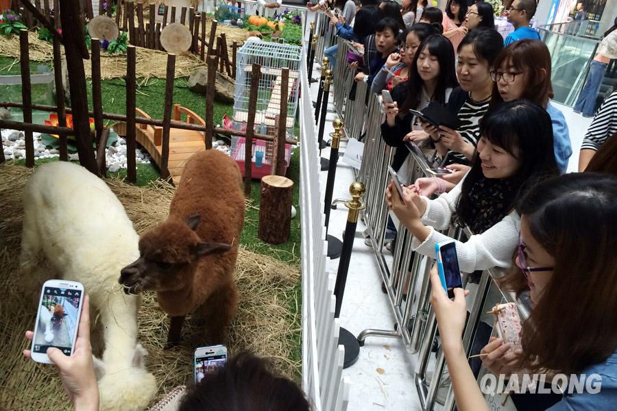 央廣網(wǎng)河南分網(wǎng)消息 據(jù)千龍網(wǎng)報(bào)道:9月19日中午,北京東直門(mén)來(lái)福士商場(chǎng)內(nèi)的一個(gè)展示區(qū)被市民圍的里三層外三層,原來(lái)是商家在這里布置了一個(gè)小型的動(dòng)物園,幾十平米的圍欄內(nèi)飼養(yǎng)了一窩黑白花色的兔子、幾只慵懶的烏龜、一只肥大的龍貓……不過(guò),最吸引市民的還是兩只被年輕人稱(chēng)為“神獸”的羊駝。