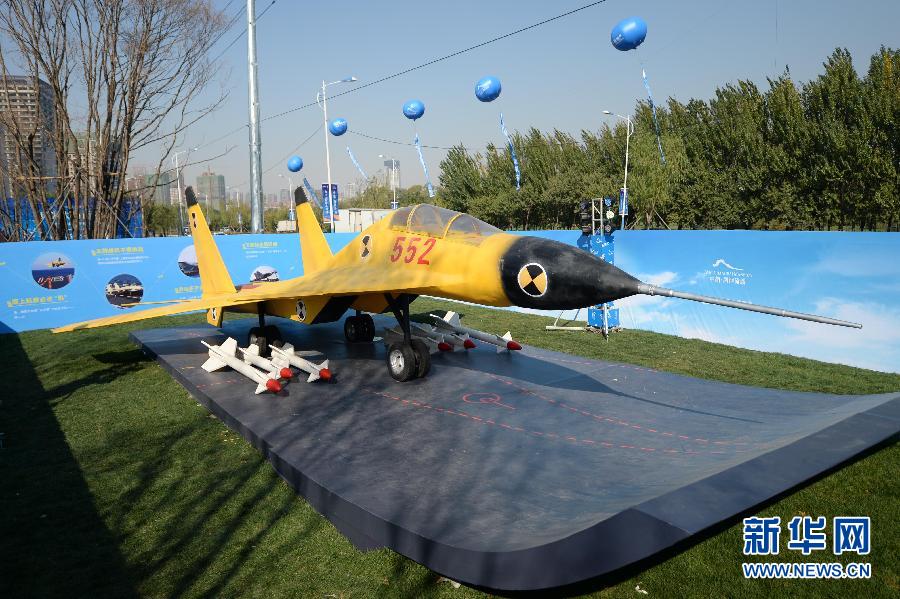 央廣網河南分網消息 據新華網報道:這是10月13日拍攝的展出的飛機模型。日前,一架遼寧艦艦載機殲-15模型“空降”沈陽。本架殲-15模型按1:1比例復制,吸引了不少市民前來觀看并合影留念。 新華社記者潘昱龍 攝