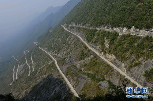 央廣網(wǎng)河南分網(wǎng)消息 據(jù)新華網(wǎng)報道:10月12日,一輛汽車行駛在湖北省恩施市新塘鄉(xiāng)雙木公路扯根坡段。位于湖北省恩施土家族苗族自治州恩施市新塘鄉(xiāng)的雙木公路(雙河至木栗園),是一條全長約20公里的鄉(xiāng)村公路,該公路經(jīng)過名為扯根坡的大懸崖,長約4.4公里,非常險峻,猶如掛在懸崖上,被稱為“壁掛”公路。
