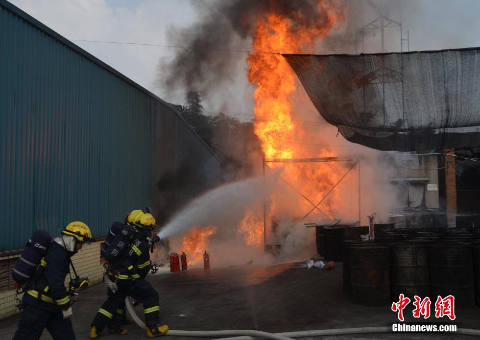 10月20日,四川綿陽(yáng)市一飼料廠發(fā)生火災(zāi),位于露天油脂灶上的6個(gè)裝滿豬油的油桶猛烈燃燒,火焰達(dá)到5米多高,起火點(diǎn)左側(cè)是一棟放著大量糧食的倉(cāng)庫(kù),右側(cè)還存放著十余桶豬油,隨時(shí)都有引起大面積燃燒的可能。綿陽(yáng)市119指揮中心接到報(bào)警后,立即調(diào)派特勤中隊(duì)趕赴現(xiàn)場(chǎng)處置。經(jīng)過(guò)消防官兵的奮力撲救,大火被成功撲滅。 中新社發(fā) 田猛 攝