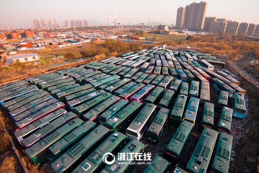12月18日下午,記者在杭州南莊兜附近的一塊荒地上找到了被戲稱為“公交車墳場”的報廢公交車停放點(diǎn),從高空俯瞰,報廢的交車密密麻麻的停放著,頗有些凄涼。據(jù)看場地的陳師傅說,11月27日,有146輛報廢公交車運(yùn)到這里停放,他知道的公交車報廢場還有2個,這些報廢車的怎樣處理他不是很清楚。