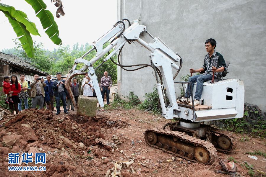 央廣網(wǎng)河南分網(wǎng)消息 5月5日,在四川省內(nèi)江市東興區(qū)柳橋鄉(xiāng)林坡村,代元武操控自制的挖掘機。近日,內(nèi)江東興區(qū)柳橋鄉(xiāng)林坡村90后小伙代元武自制了一臺挖掘機,吸引了鄉(xiāng)親們的目光。該挖掘機是代元武花費3個月時間設(shè)計拼裝而成,花費約3萬元。他為這臺小型挖掘機設(shè)計了履帶,同時增添了大小臂伸縮功能,以便于在狹小空間內(nèi)作業(yè),更加適合在農(nóng)村使用。新華社發(fā)(蘭自濤 攝)