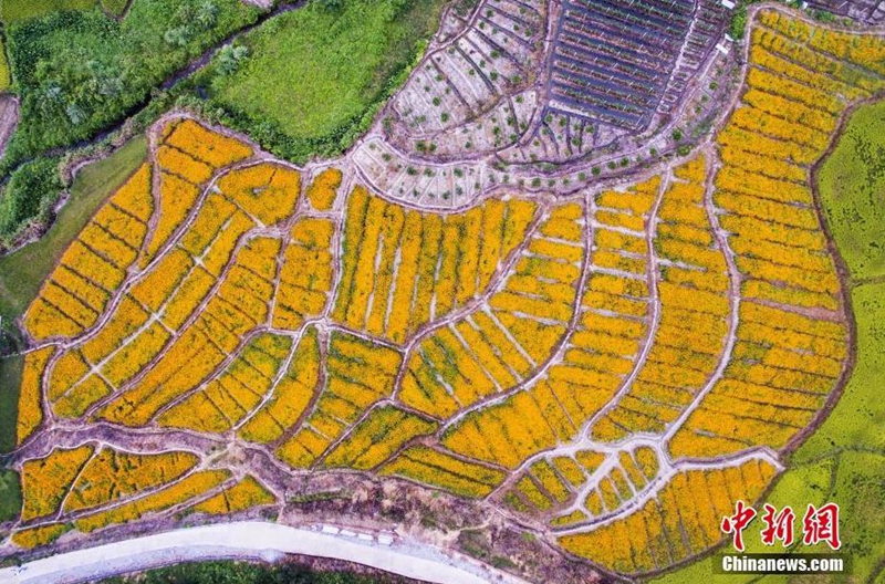 9月22日,在江西省上饒市鉛山縣永平鎮(zhèn)打石塢秀美新村,秋色迷人如童話般美麗。今年以來,該鎮(zhèn)籌集近千萬元資金,按照“縱情山水騎行處,養(yǎng)心參禪桃花源”的理念,打造四季花海之地。目前,首批栽種的小皺菊已盛開,游客絡(luò)繹不絕。丁銘華 攝 -