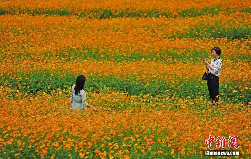 目前,首批栽種的小皺菊已盛開,游客絡(luò)繹不絕。丁銘華 攝 -
