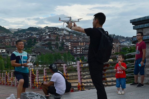 此次報(bào)名參加“空中瞰茅臺”活動(dòng)的,不僅有從四面八方趕來的貴州旅游在線的忠實(shí)攝友,還有十余位貴州領(lǐng)空俱樂部的大疆無人機(jī)攝影師。在1915廣場上,這些新鮮玩意兒吸引來了大量市民與外地游客圍觀!斑@個(gè)飛機(jī)真酷!是拿來拍照的吧?”市民余劉先生忍不住好奇詢問,得知可以用來拍照和視頻更是不斷感慨,“現(xiàn)在的科技越來越發(fā)達(dá)了,拍照都能飛到天上拍咯!”