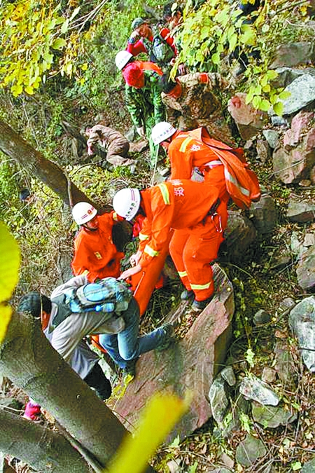 公安、消防、林業(yè)、醫(yī)院、驢友等各路人馬組成的救援隊,兵分四路,耗時4個小時成功救出被困者。