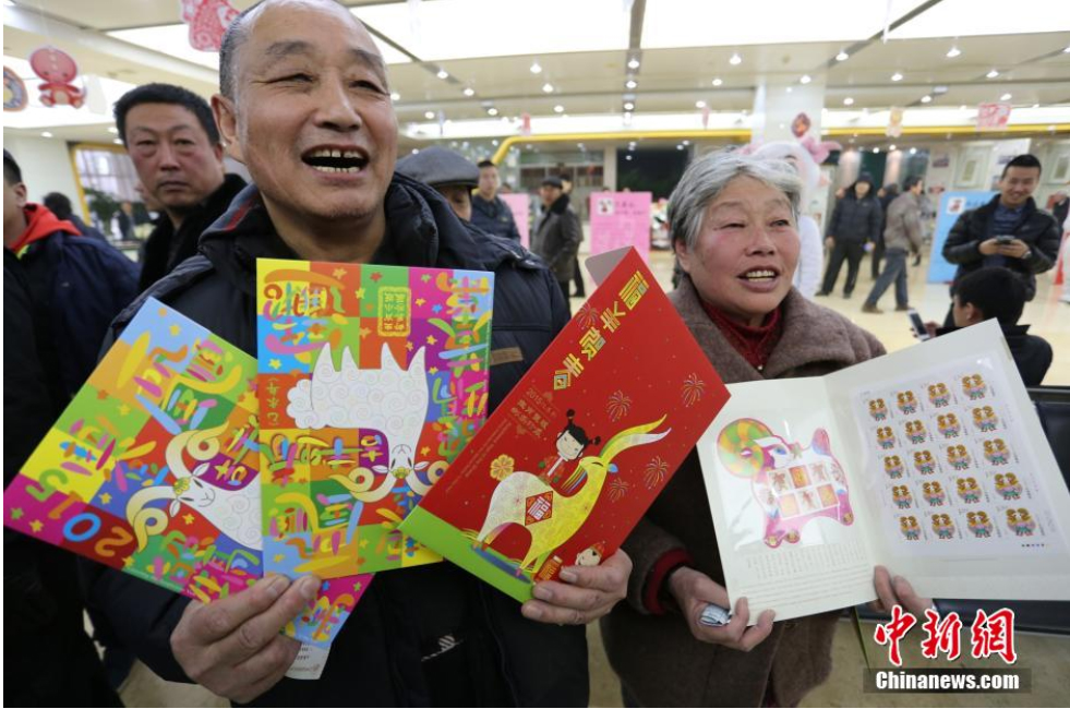 1月5日,河南鄭州市民應大媽和老伴從零晨2點起就排隊,買到了《乙未年》生肖特種郵票。當日,中國郵政在內(nèi)地發(fā)行《乙未年》特種郵票1套1枚,全套郵票面值為1.20元。該套郵票是中國郵政發(fā)行的第三輪生肖郵票的收官之作。農(nóng)歷乙未年是羊年,郵票上的羊以綿羊作為造型基礎,羊角裝飾有纏枝花草紋,羊身上為牡丹、蓮花等花卉圖案,并伴以祥云、水波紋,整個畫面蘊含著吉祥、圓滿和幸福綿長的寓意,寄托了對新的一年的美好祈盼。該票甫一推出,就受到市民追捧。 中新社發(fā) 楊正華 攝