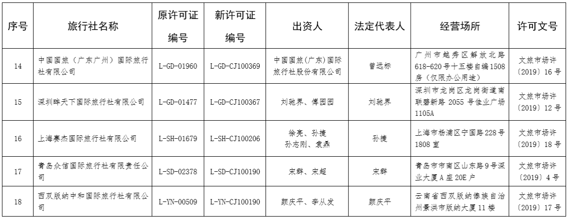 央廣網(wǎng)北京5月28日消息(記者梁晨) 5月27日,文化和旅游部發(fā)布《關(guān)于許可旅行社經(jīng)營(yíng)出境游業(yè)務(wù)的公告》。公告顯示,按照《旅行社條例》和《中國(guó)公民出國(guó)旅游管理辦法》,許可以下18家旅行社經(jīng)營(yíng)出境游業(yè)務(wù):