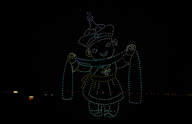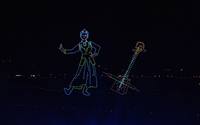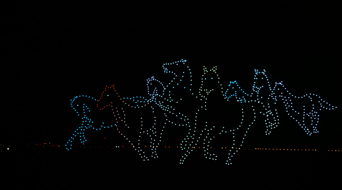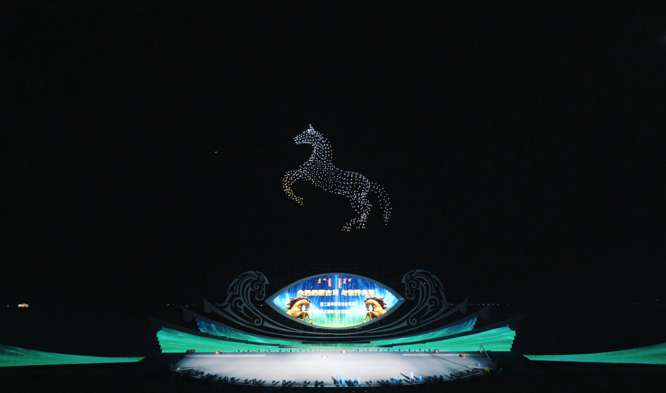 此次開(kāi)幕中最令人印象深刻的便是,空中千架3D動(dòng)態(tài)無(wú)人機(jī)編隊(duì)組成各式各樣的圖案。有馳騁的駿馬、有八駿圖、有少女迎賓圖以及“吃苦耐勞、一往無(wú)前,不達(dá)目的絕不罷休”的蒙古馬精神字樣。無(wú)人機(jī)表演將技術(shù)與文化藝術(shù)完美融合,用聲光色形象生動(dòng)的詮釋方式,以色彩繽紛的視覺(jué)效果,為觀眾帶來(lái)層次豐富的觀賞體驗(yàn)。用高科技營(yíng)造了現(xiàn)代草原的感覺(jué)。夜空中不斷變化閃爍的燈光,給觀眾帶來(lái)全新的視覺(jué)沖擊,為開(kāi)幕劃下了完美的句號(hào)。不僅讓現(xiàn)場(chǎng)觀眾贊嘆不已,還為內(nèi)蒙古特色的文化旅游發(fā)展之路創(chuàng)造美好的條件。