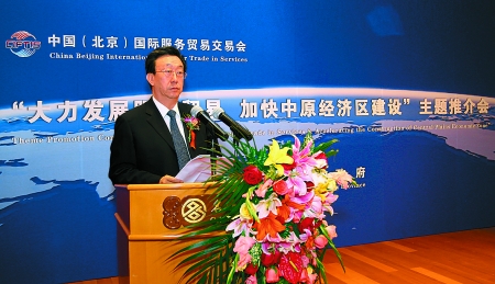 5月28日,“大力發(fā)展服務(wù)貿(mào)易 加快中原經(jīng)濟(jì)區(qū)建設(shè)”主題推介會(huì)在北京隆重舉行。省長郭庚茂發(fā)表主題演講。記者 董亮 攝