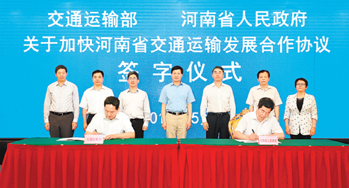 5月22日,河南省人民政府與交通運(yùn)輸部在鄭州簽署《關(guān)于加快河南省交通運(yùn)輸發(fā)展合作協(xié)議》。(本報記者 董亮 攝)