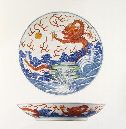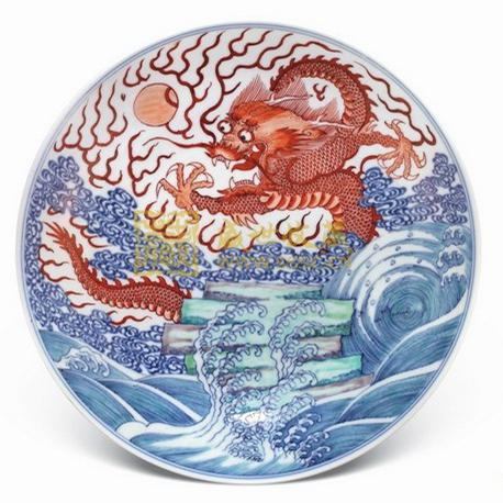 上海斗寶藝術(shù)展出青花斗彩海水龍紋盤