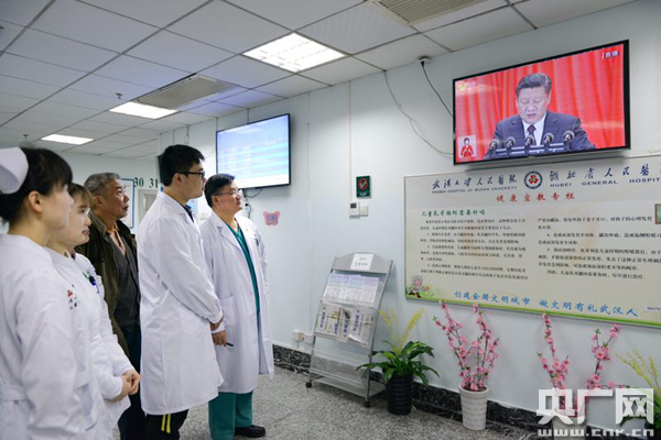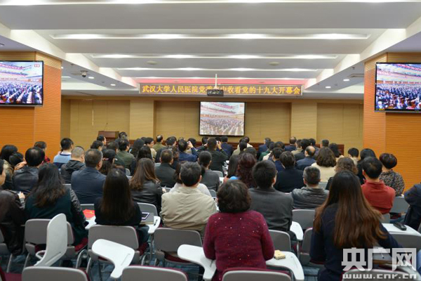 央廣網(wǎng)北京10月18日消息(記者張毛清 通訊員杜巍巍 高婷)18日上午,在武漢大學(xué)人民醫(yī)院,在院黨委書記萬紅慧的精心組織下,從學(xué)術(shù)活動中心的黨的直播分會場到各病區(qū)、候診區(qū)的電視轉(zhuǎn)播,干部、職工以及病人以多種形式收看了十九大開幕盛況。