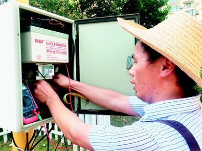 圖為:李中華檢查氣象區(qū)域自動站電壓情況 楚天都市報記者陳希攝