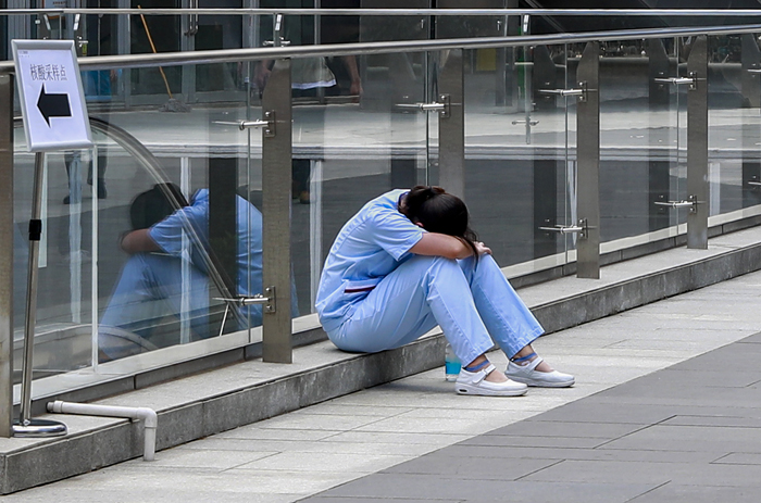 圖為:核酸采樣點(diǎn)旁,一名輪換下來的醫(yī)護(hù)人員正在休息 央廣網(wǎng)發(fā) 通訊員供圖