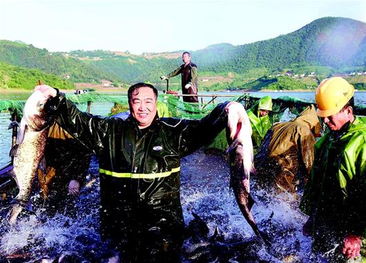 6月3日,保康縣寺坪鎮(zhèn)南河漁業(yè)農民專業(yè)合作社漁民在收網捕魚。該合作社由112戶村民組成,進行立體生態(tài)深水養(yǎng)魚,10多種生態(tài)魚深受消費者青睞,暢銷成都、廣州、重慶、南京、北京等城市,社員戶均年增收3萬元以上。近年來,?悼h全面推行河庫長制,大力實行退耕還林、天然林保護等生態(tài)修復工程,庫區(qū)水環(huán)境越來越好,讓當地百姓享受到了“綠水青山就是金山銀山”的紅利。(視界網 陳泉霖 攝)