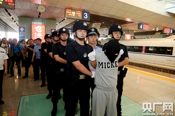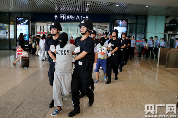 圖為:5月27日下午,從云南押解回漢的6名嫌疑人抵達(dá)武漢火車站(應(yīng)后威攝)