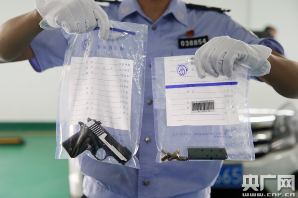 圖為:收繳涉案的西格紹爾手槍一只和子彈5發(fā)(應(yīng)后威攝)