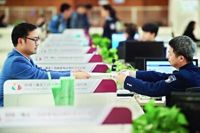 中國(湖北)自由貿(mào)易試驗(yàn)區(qū)武漢片區(qū),企業(yè)在大廳辦理業(yè)務(wù)。記者任勇攝