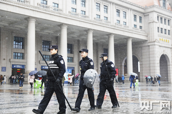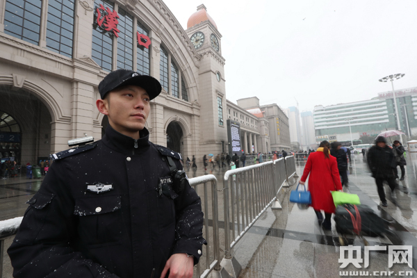 圖為:1月26日,漢口火車(chē)站,武漢鐵路民警冒雪值守,護(hù)衛(wèi)旅客平安出行。
