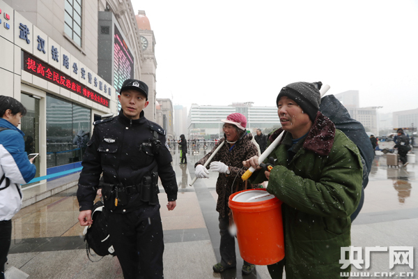 圖為:1月26日,漢口火車(chē)站,武漢鐵路民警冒雪為務(wù)工人員答疑解惑。