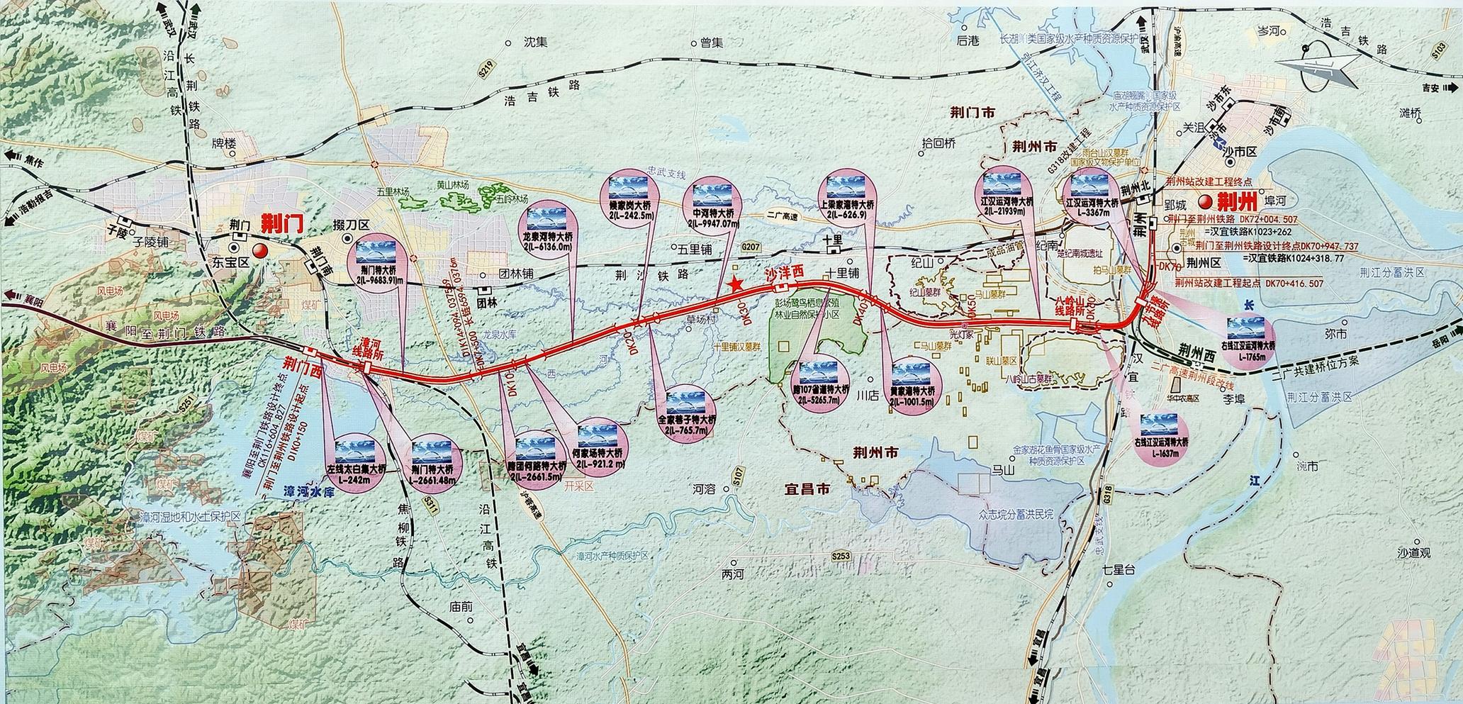 荊荊鐵路自沿江高鐵武漢至宜昌段荊門(mén)西站引出,經(jīng)沙洋西引入漢宜鐵路荊州站,全長(zhǎng)77公里,設(shè)計(jì)時(shí)速350公里。