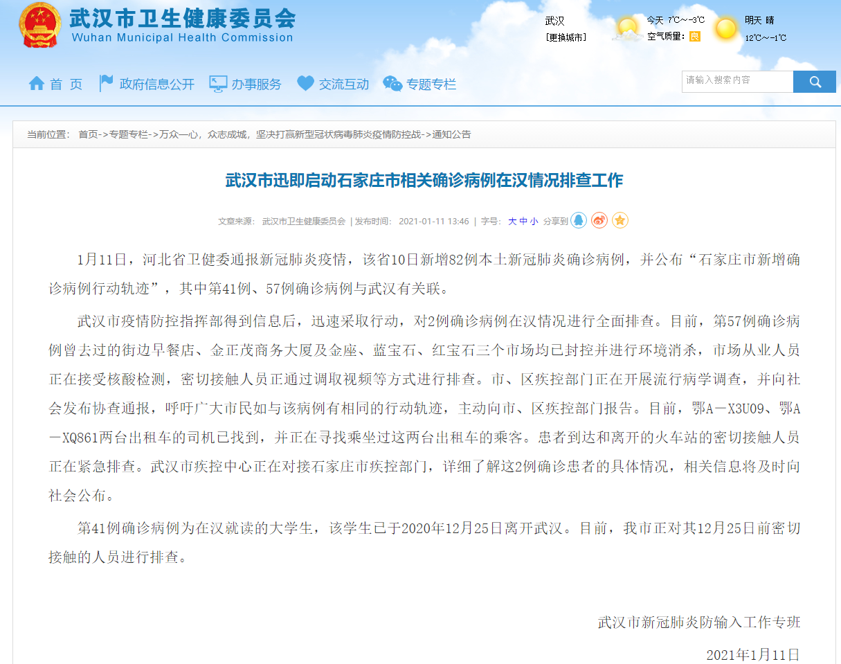 央廣網(wǎng)武漢1月11日消息(記者凌姝 張卓)據(jù)武漢市衛(wèi)生健康委員會(huì)1月11日通報(bào)顯示,河北省衛(wèi)健委通報(bào)“石家莊市新增確診病例行動(dòng)軌跡”中第41例、57例確診病例與武漢有關(guān)聯(lián)。武漢市疫情防控指揮部得到信息后,迅速采取行動(dòng),對(duì)2例確診病例在漢情況進(jìn)行全面排查。