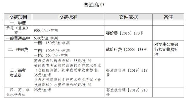 武漢市普通高中收費項目,包括學(xué)費、住宿費、高考考試費。其中,示范(重點)高中每學(xué)期學(xué)費900元/生,一般普通高中630元/生。住宿費分3檔:150元/生、100元/生、50元/生,學(xué)生公寓另行核定收費標準。
