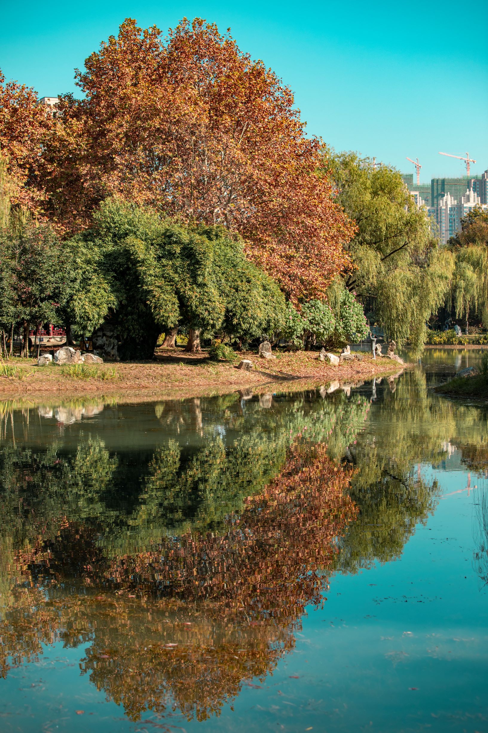 堤角公園“前身”為種苗場,本無湖。為打造出“江南水鄉(xiāng)”景致,開挖了一個人工湖。湖畔種了排排柳樹。挖出來的淤泥,則在湖邊形成小圍坡,依水成景。