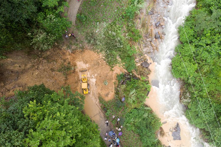 7月7日,在石門縣壺瓶山鎮(zhèn)龍池河村,救援人員疏通因山體滑坡中斷的道路(無(wú)人機(jī)照片)。新華社發(fā)(陳思汗 攝)