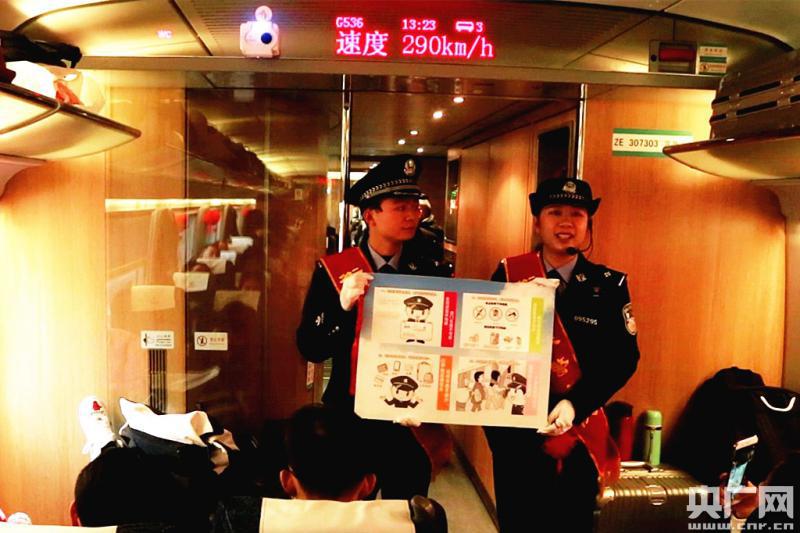當(dāng)天,乘警支隊的青年民警踏上桂林至長沙南的高鐵列車,利用自己制作小展板講解春運安全小知識,推廣微信報警平臺和衡陽鐵警青年公眾號,向廣大旅客宣傳文明乘車相關(guān)規(guī)范,并及時發(fā)現(xiàn)、勸導(dǎo)在車廂內(nèi)奔跑、吵鬧等不文明行為,宣傳在列車內(nèi)吸煙、霸座是違法行為,營造和諧、溫馨、有序的旅途環(huán)境。民警還采取有獎問答的方式吸引了眾多乘客的參與,一問一答之間,春運安全小知識和常見警情及防范技巧便被旅客們記在了心里。與此同時,乘警支隊青年沖鋒隊還邀請了列車乘警——衡陽鐵路公安處乘警支隊歐廣偉警長給旅客們分享了列車常見警情和防范措施,乘客都認真聆聽。