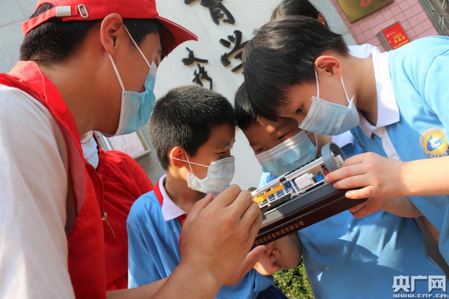 志愿者在引導長沙市特殊教育學校的孩子們用手觸摸盾構機模型,并為他們講述地鐵建設的故事(央廣網發(fā) 受訪者供圖)