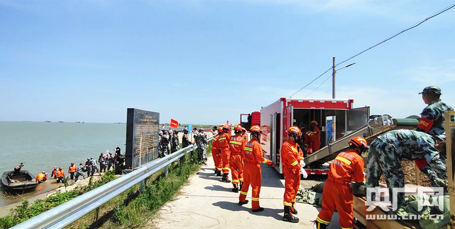 湖南省岳陽縣中洲大堤防汛演練現(xiàn)場(央廣網(wǎng)記者 堯遙 攝)