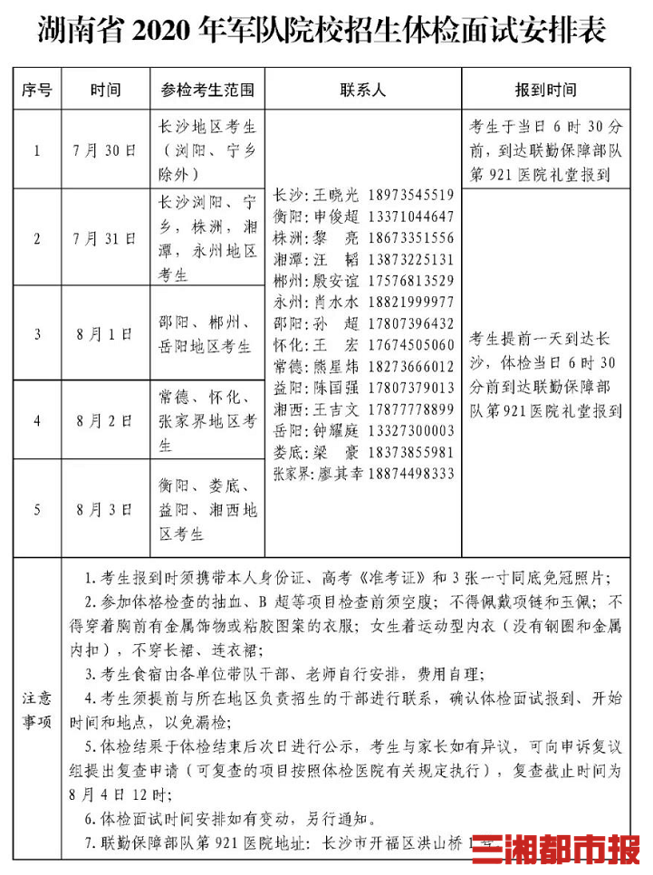 據(jù)悉,2020年湖南省軍校招生體檢面試工作在長沙921醫(yī)院進行(詳情見文末表格),考生需按照通知要求,于體檢當(dāng)日6:30前到921醫(yī)院禮堂報到,經(jīng)工作人員防疫檢查、核對考生身份證和準(zhǔn)考證后進入待檢區(qū),現(xiàn)場指揮員按10至20人一組進行編組,編組后由引導(dǎo)員帶領(lǐng)該組考生前往候檢區(qū)等待,體檢、面試、心理測試交叉進行。