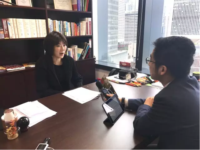 容海恩議員(左)正在接受央廣記者采訪