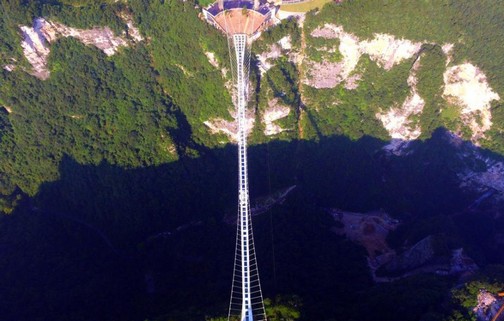 選址在張家界大峽谷風(fēng)景區(qū)栗樹埡和吳王坡區(qū)域內(nèi)的這座玻璃橋長430米、寬6米,橋面鋪設(shè)了99塊三層疊加而成的鋼化玻璃,厚度僅0.6米,創(chuàng)造了世界最長、世界最高、世界首座玻璃作為主受力結(jié)構(gòu)的大型橋梁等多項“世界之最”。