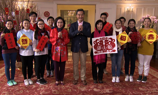 香港之聲《新聞時(shí)空》消息 香港特別行政區(qū)行政長官梁振英27日向香港市民拜年。他與太太一同祝愿香港市民身體健康、心想事成、萬事如意。