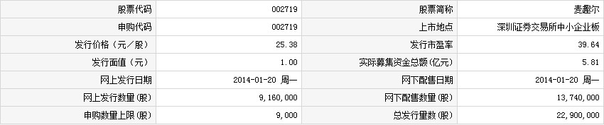 麥趣爾此次發(fā)行總數(shù)為2,290萬股,網(wǎng)上發(fā)行916萬股,發(fā)行市盈率39.64倍,申購代碼:002719,申購價(jià)格:25.38元,單一帳戶申購上限9,000股。