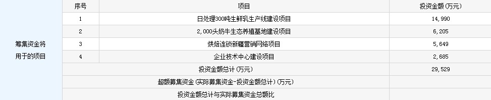 公司現(xiàn)有門店38家,計(jì)劃建設(shè)42家門店和6家中央工廠。本次募投項(xiàng)目為日處理300噸生鮮乳生產(chǎn)線(目前產(chǎn)能日處理100噸)、2000頭奶牛生態(tài)養(yǎng)殖基地建設(shè)、烘焙連鎖新疆營銷網(wǎng)絡(luò)和企業(yè)技術(shù)中心建設(shè)。