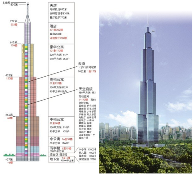 這部宣傳片列舉了一長(zhǎng)串驚人數(shù)字:“天空城市”將建造838米,地上202層,地下6層,共計(jì)208層,超越迪拜哈里發(fā)塔(828米)成為世界第一高樓。項(xiàng)目?jī)粽嫉?0畝,建筑面積105萬(wàn)平方米,9級(jí)地震不倒。