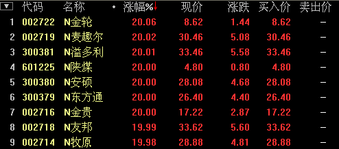 早盤9只新股全部"頂格"高開20%,金輪股份漲20.06%報(bào)8.62元,麥趣爾漲20.02%報(bào)30.46元,溢多利漲20.01%報(bào)33.46元,陜西煤業(yè)漲20.00%報(bào)4.80元,安碩信息漲20.00%報(bào)28.08元,東方通漲20.00%報(bào)26.40元,金貴銀業(yè)漲20.00%報(bào)17.22元,友邦吊頂漲19.99%報(bào)33.62元,牧原股份漲19.98%報(bào)28.88元。