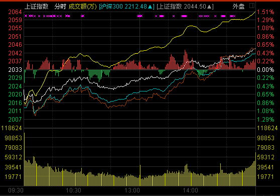截至收盤,滬指報2044.50點,上漲11.42點點,漲幅0.56%,成交678.30億元;深成指報7616.57點,上漲43.94點,漲幅0.58%,成交1139.54億元;創(chuàng)業(yè)板指報1532.69點,上漲36.71點,漲幅2.45%,成交341.63億元。
