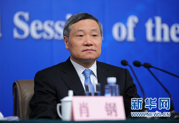 十二屆全國(guó)人大二次會(huì)議新聞中心于3月11日上午9時(shí)在梅地亞中心多功能廳舉行記者會(huì),邀請(qǐng)中國(guó)人民銀行行長(zhǎng)周小川等五位嘉賓就“金融改革與發(fā)展”的相關(guān)問(wèn)題回答中外記者的提問(wèn)。圖為證監(jiān)會(huì)主席肖鋼。