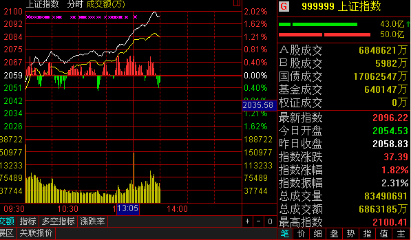 午后滬指飆漲觸及2100點 藍籌股拉抬