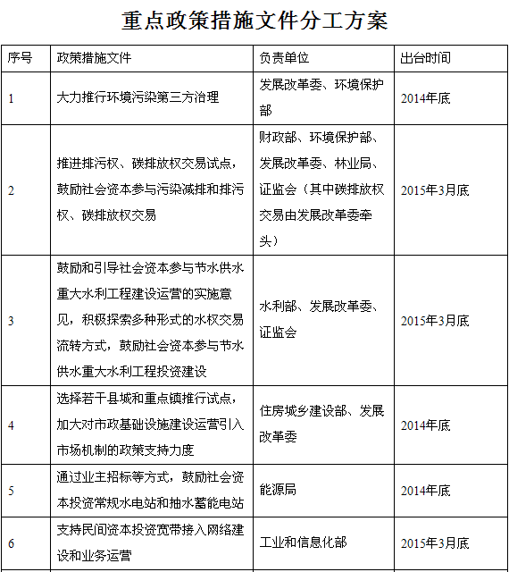 。ㄎ澹┩苿迎h(huán)境污染治理市場化。在電力、鋼鐵等重點行業(yè)以及開發(fā)區(qū)(工業(yè)園區(qū))污染治理等領(lǐng)域,大力推行環(huán)境污染第三方治理,通過委托治理服務(wù)、托管運營服務(wù)等方式,由排污企業(yè)付費購買專業(yè)環(huán)境服務(wù)公司的治污減排服務(wù),提高污染治理的產(chǎn)業(yè)化、專業(yè)化程度。穩(wěn)妥推進政府向社會購買環(huán)境監(jiān)測服務(wù)。建立重點行業(yè)第三方治污企業(yè)推薦制度。