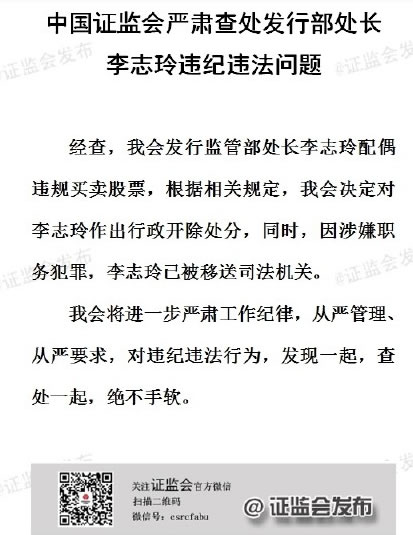 據(jù)證監(jiān)會官方微博最新消息,中國證監(jiān)會嚴(yán)肅查處發(fā)行部處長李志玲違紀(jì)違法問題。經(jīng)查,證監(jiān)會監(jiān)管部處長李志玲配偶違規(guī)買賣股票,根據(jù)相關(guān)規(guī)定,證監(jiān)會決定對李志玲作出行政開除處分,同時,因涉嫌職務(wù)犯罪,李志玲已被移送司法機關(guān)。