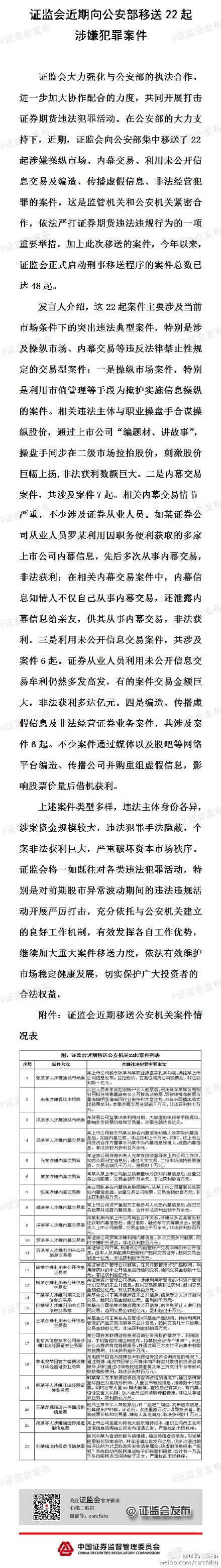證監(jiān)會向公安部移送22起涉嫌犯罪案件