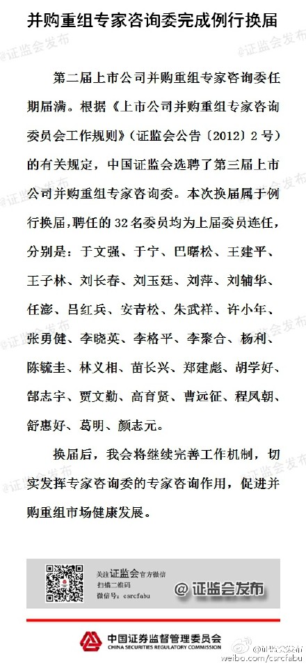 證監(jiān)會:并購重組專家咨詢委完成例行換屆
