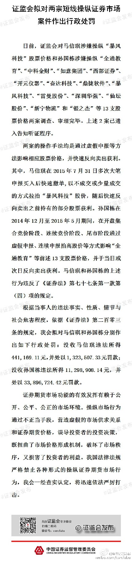 依據(jù)證券法第203條的規(guī)定,證監(jiān)會擬對馬信琪和孫國棟分別作出如下行政罰沒:沒收馬信琪違法所得44萬余元,并處以132萬余元的罰款;沒收孫國棟1129萬余元,并處以3389萬余元的罰款。