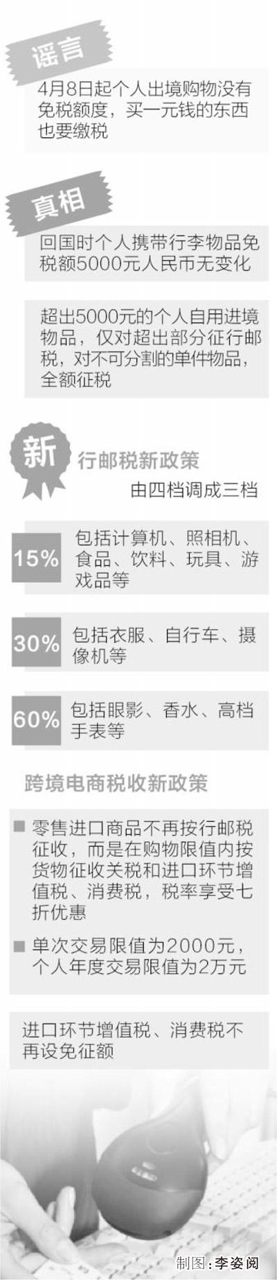 “這個(gè)說(shuō)法是毫無(wú)根據(jù)的,無(wú)論是到境外旅游、出差還是探親訪友,回國(guó)時(shí)個(gè)人攜帶行李物品免稅額5000元并沒(méi)有變化!必(cái)政部有關(guān)人士表示,這次調(diào)整的主要是跨境電商零售進(jìn)口商品稅收政策,以及行郵稅政策。進(jìn)境居民旅客攜帶在境外獲取的個(gè)人自用、合理數(shù)量進(jìn)境物品,總值在5000元人民幣以內(nèi)(含5000元)的,海關(guān)予以免稅放行。